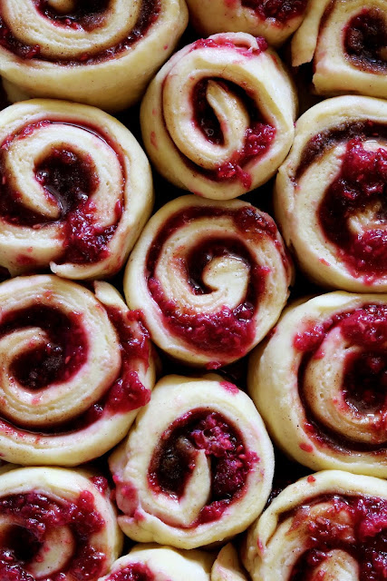 - Raspberries. Adding the raspberries is going to be a bit messy and it will make your dough feel a bit odd (almost slick). They’re going to break and you might even have a bit of a panic attack and think you’re doing it wrong. You’re not. Punch on through. You can do it. Also, make sure that you clean and dry your fruit (completely) in advance of adding it to the dough. Likewise make sure it is fresh, ripe and firm. If the fruit is overripe it will bleed like hell all over the dough. The fruit will bleed regardless, however overripe fruit will make it worse. We want pretty streaks, not a crime scene.